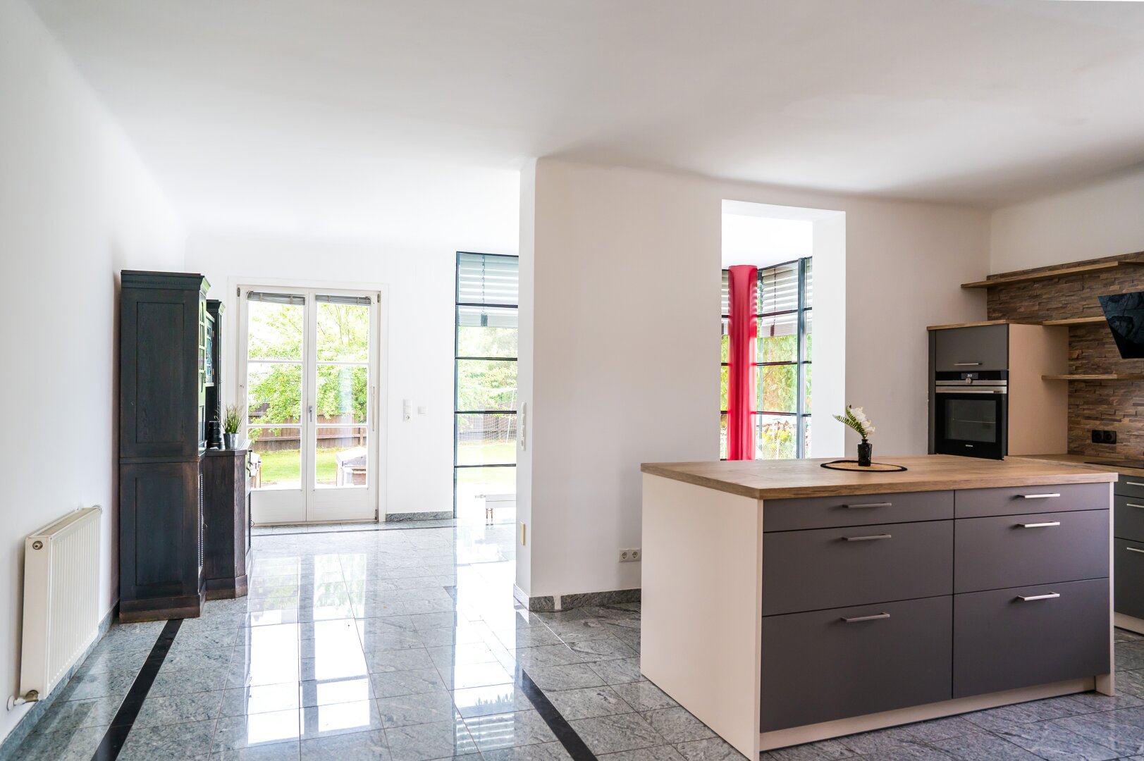 Das Wohnhaus ist großzügig aufgeteilt. Im Erdgeschoß befindet sich eine tolle Einbauküche mit angrenzendem Essbereich und Ausblick in den Garten. Der zusätzliche Ofen im Wohnzimmer spendet in den kalten Monaten wohlige Wärme.