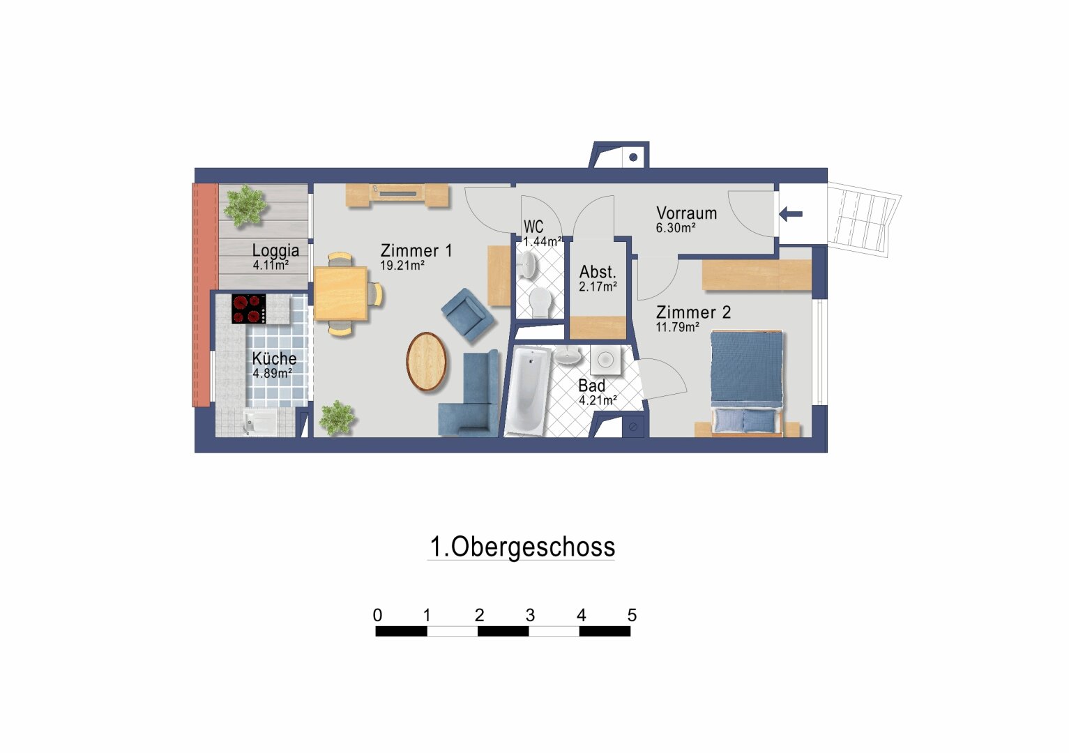 - Wohnfläche: ca. 50 m² Wohnnutzfläche + 4m² Loggia im 1. Stock.