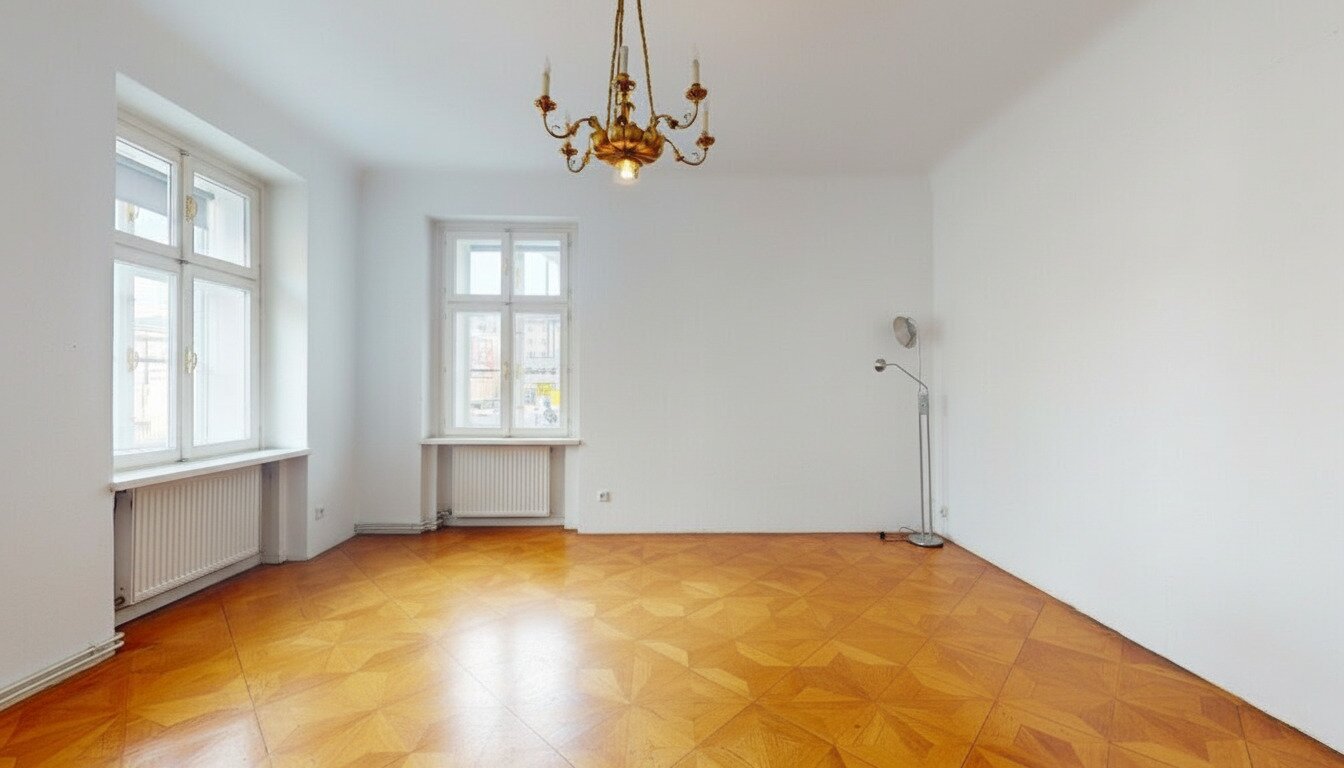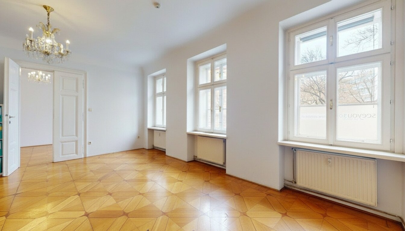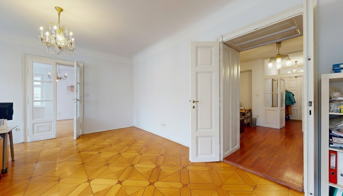 Klassische Wiener Architektur, eleganter Sternparkettboden und ein gepflegtes Gesamtbild verleihen der Fläche Charakter, Wiedererkennungswert und eine angenehme Arbeitsatmosphäre.