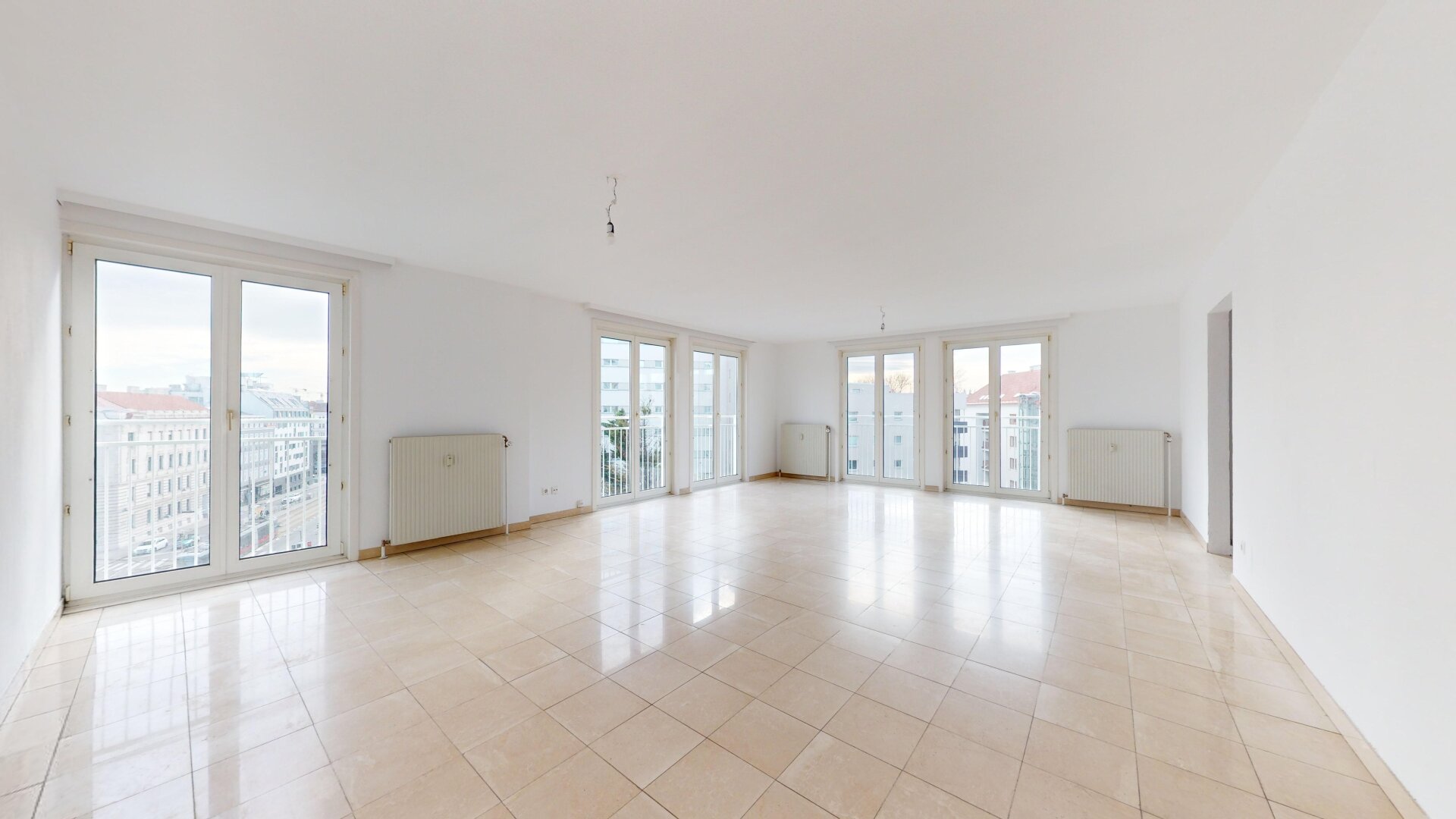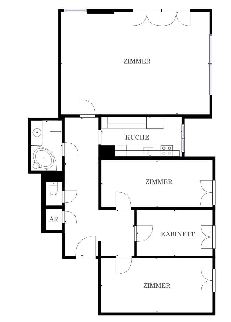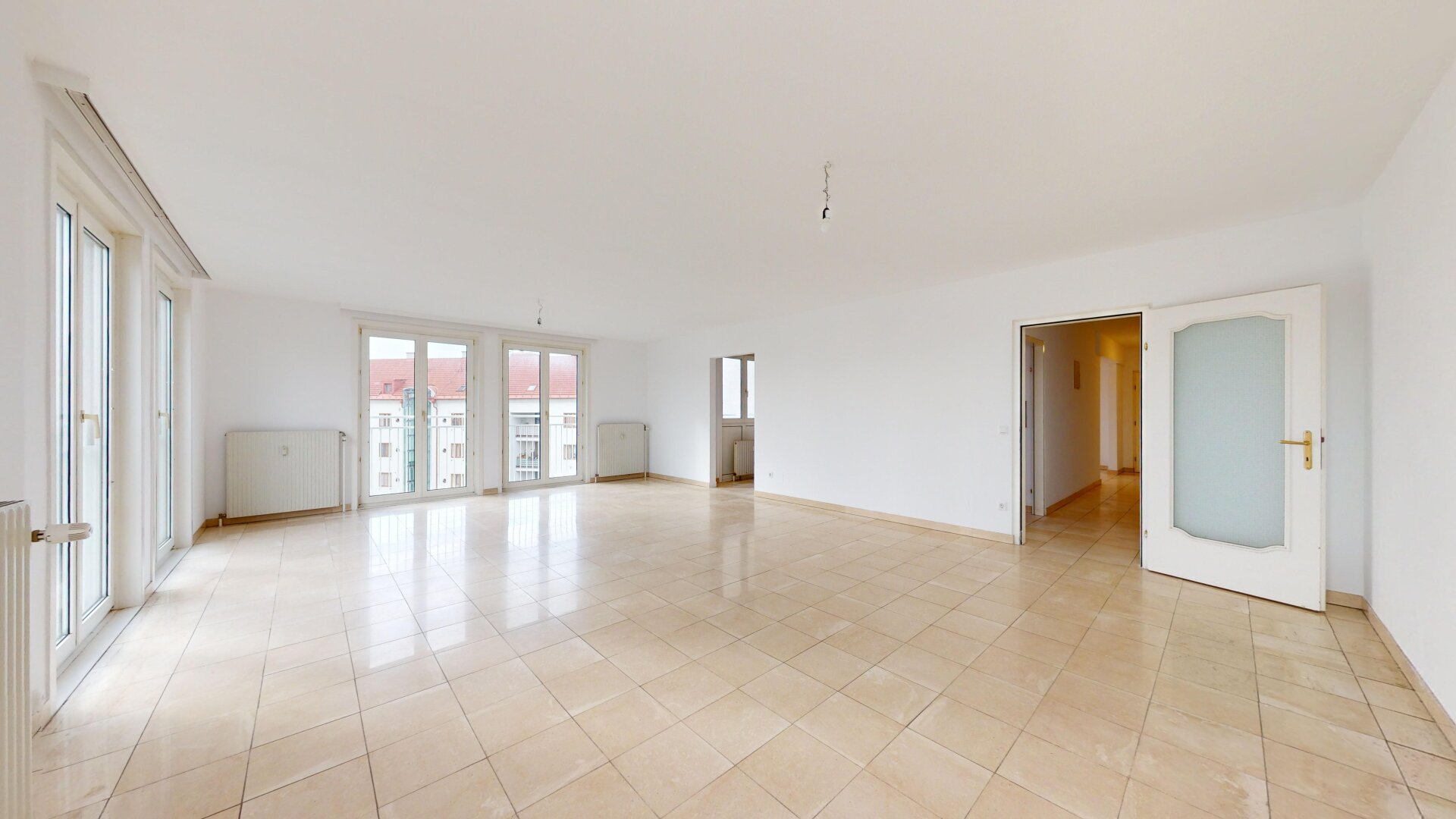 Großzügige, zentral begehbare 4-Zimmerwohnung. Sehr großes 44m² Wohnzimmer plus 3 Schlafzimmer. Separate Küche mit allen elektrischen Geräten, Badezimmer mit Eckbadewanne und Waschmaschinen-Anschluss, separate Toilette und Abstellraum. Praktischer, strapazierfähiger Fliesenboden in allen Räumen außer den Schlafzimmern in denen sich Parkettböden befinden. Angenehme französische Balkone und damit helle Fensterfronten in allen Zimmern.