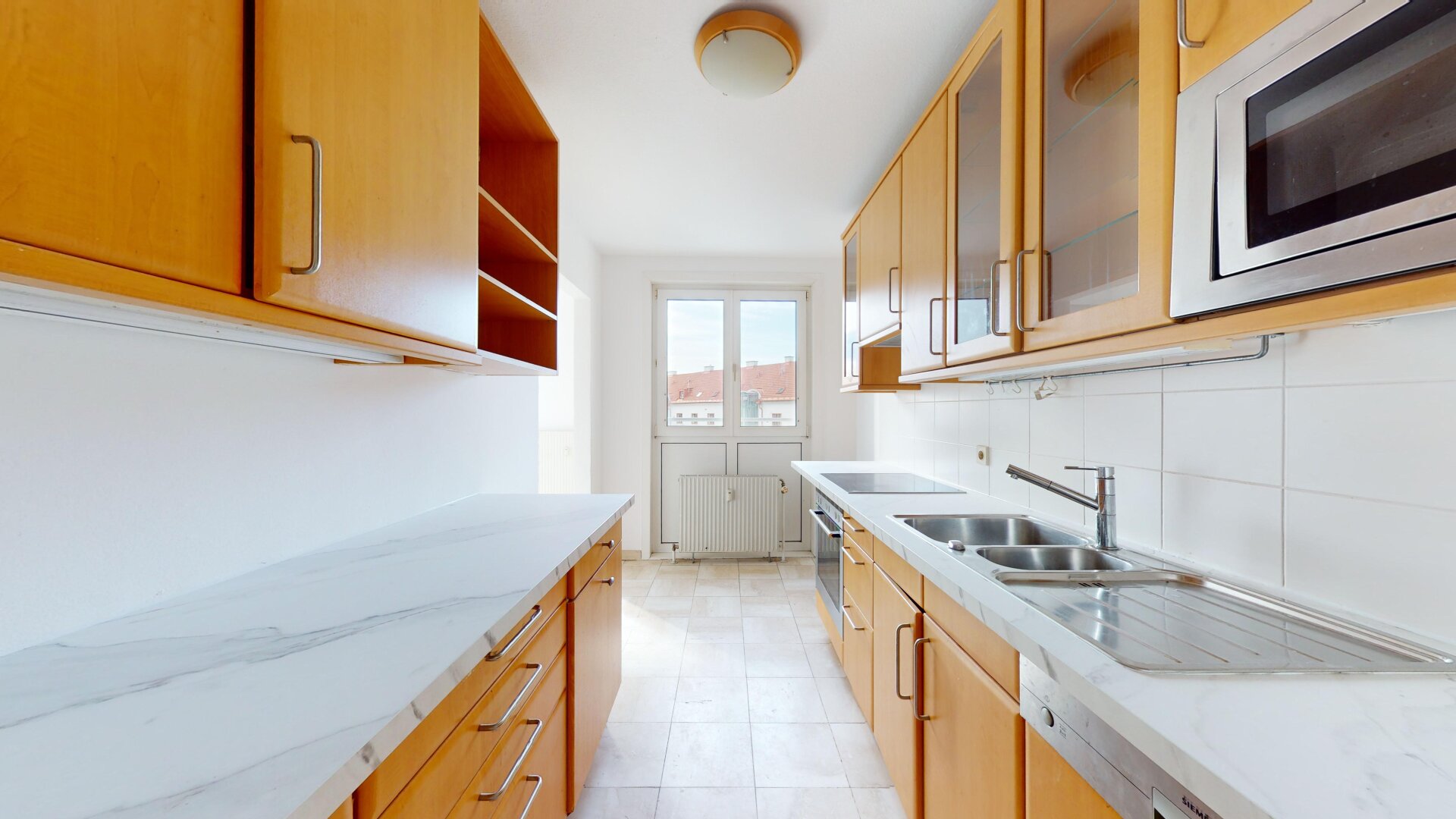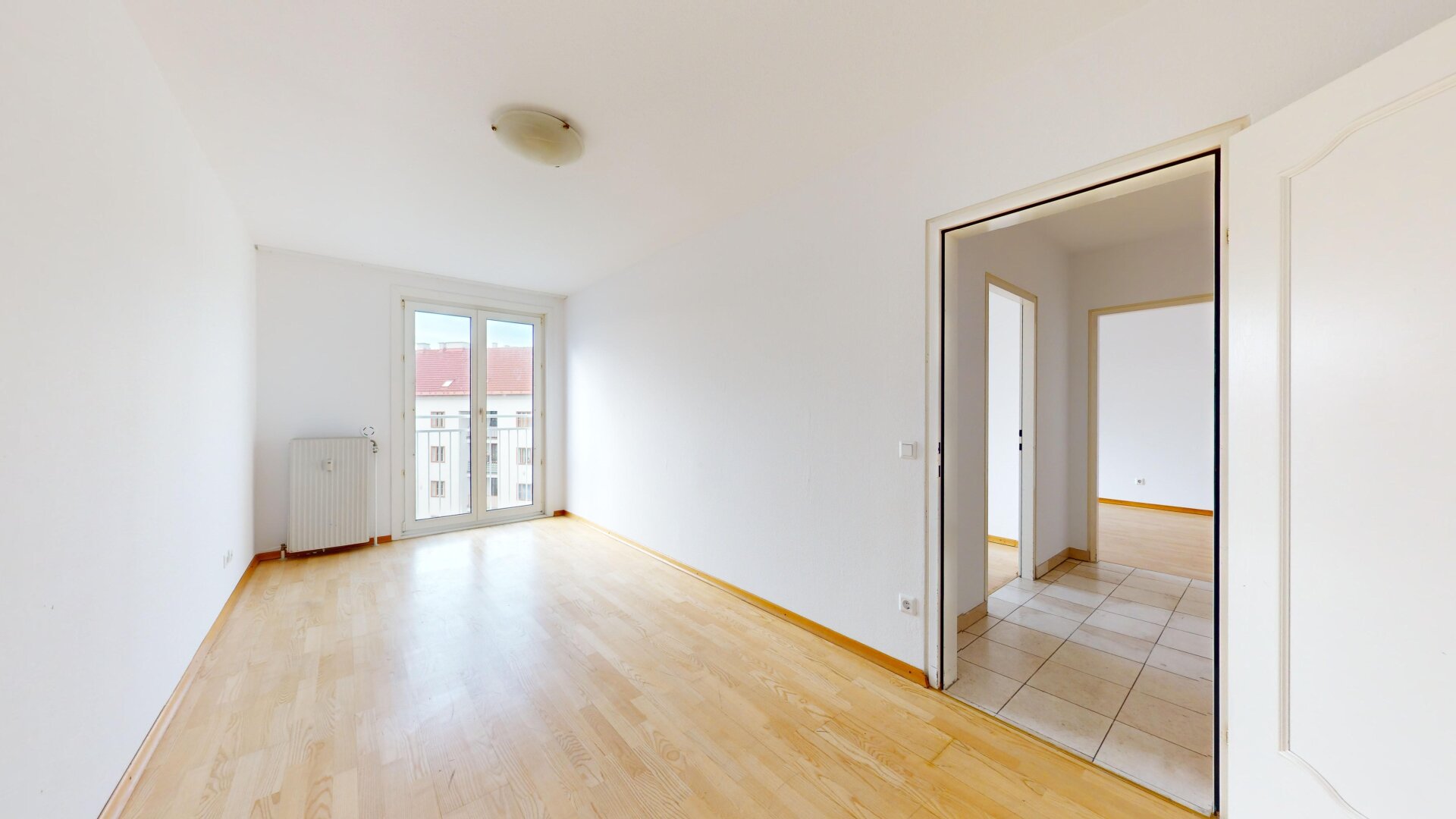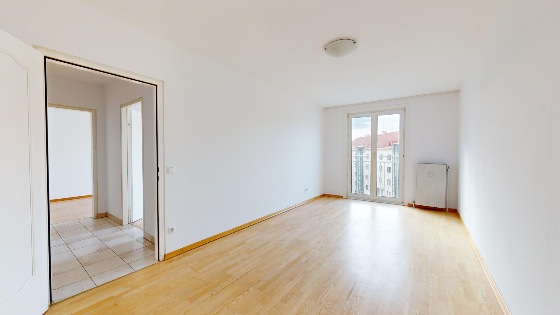 Großzügige, zentral begehbare 4-Zimmerwohnung. Sehr großes 44m² Wohnzimmer plus 3 Schlafzimmer. Separate Küche mit allen elektrischen Geräten, Badezimmer mit Eckbadewanne und Waschmaschinen-Anschluss, separate Toilette und Abstellraum. Praktischer, strapazierfähiger Fliesenboden in allen Räumen außer den Schlafzimmern in denen sich Parkettböden befinden. Angenehme französische Balkone und damit helle Fensterfronten in allen Zimmern.