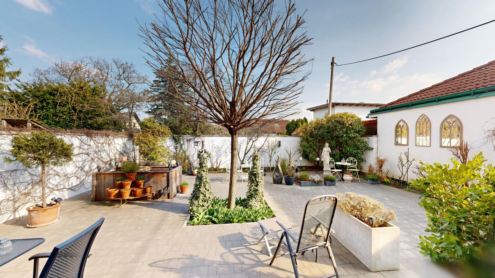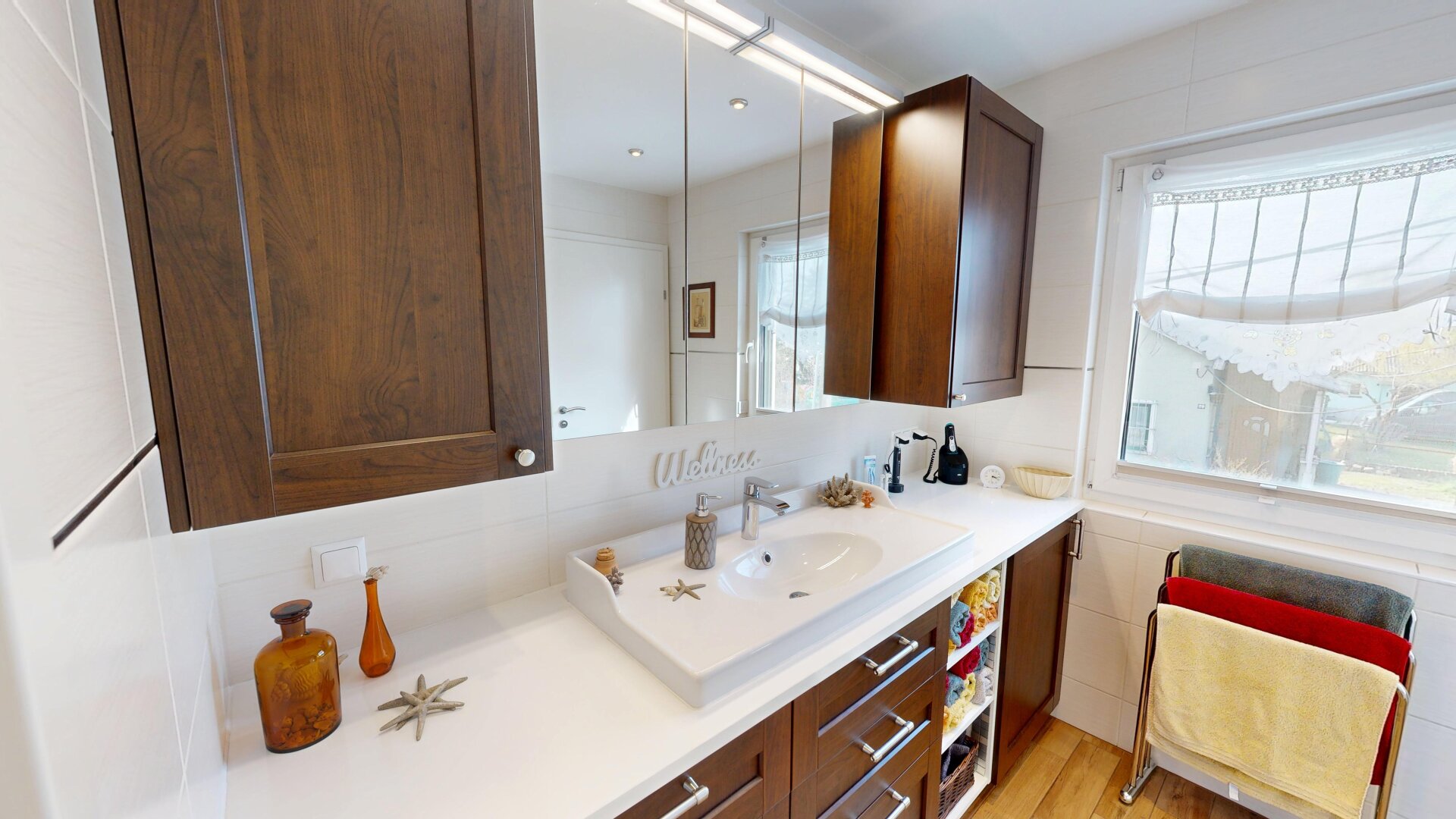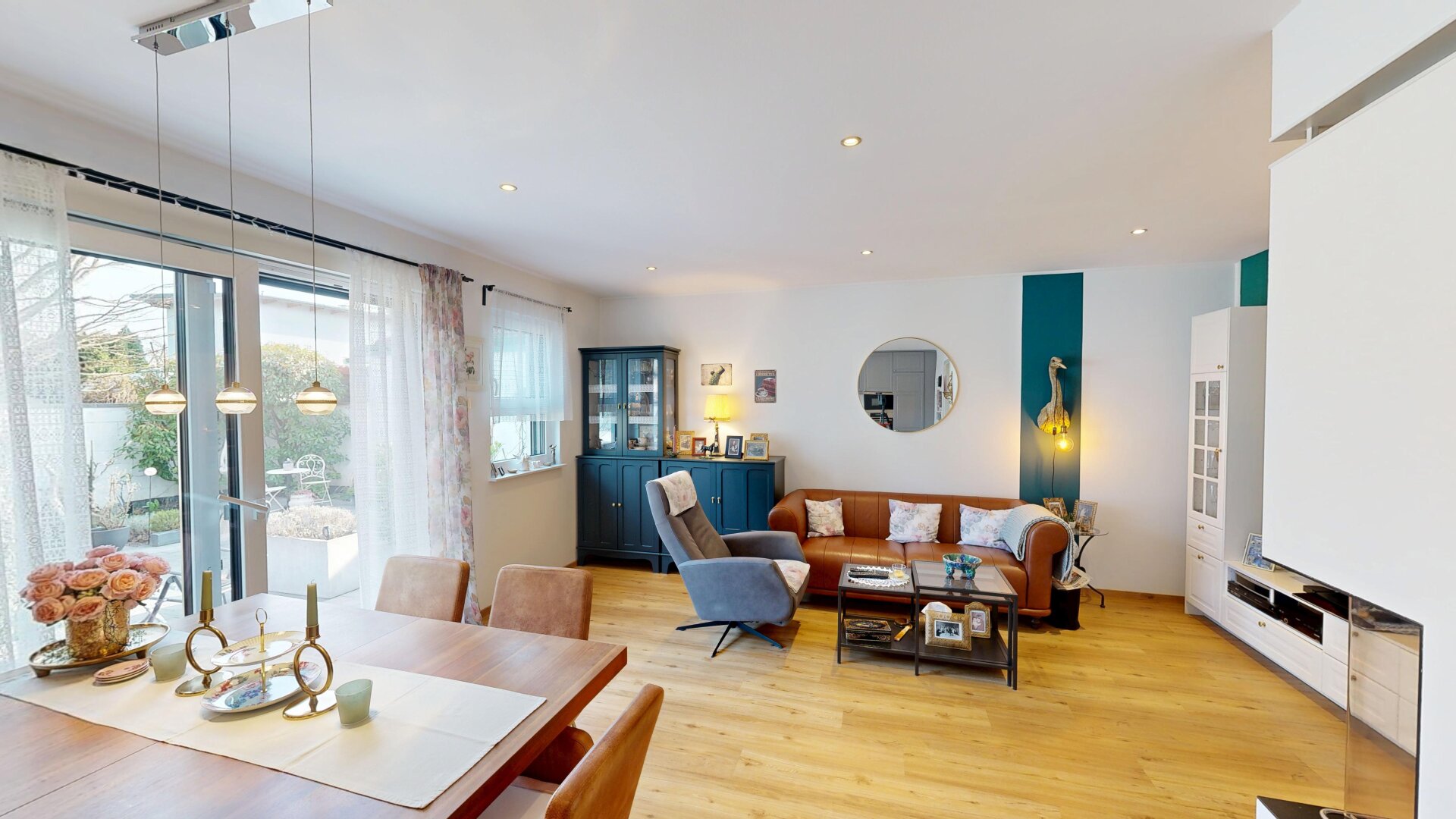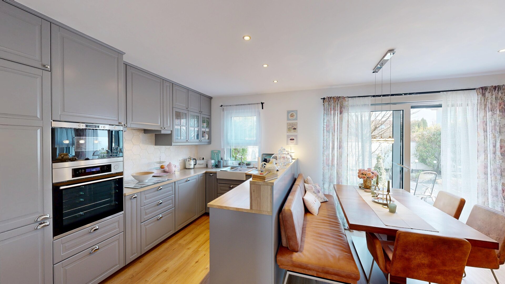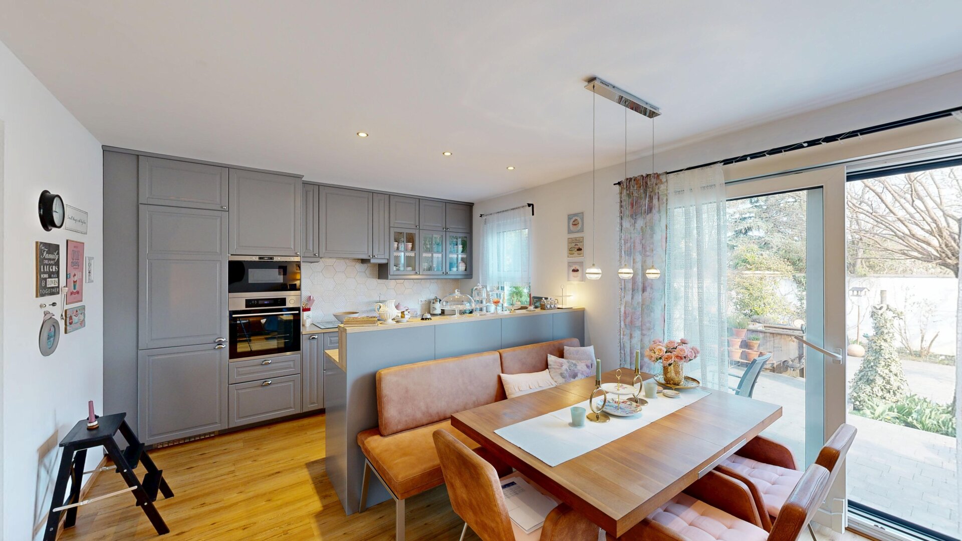 Im Erdgeschoss befinden sich eine offene Wohnküche (ca. 32 m2), ein Arbeitszimmer, ein WC mit Haustechnikraum sowie eine Diele mit Zugang zur ca. 15 m2 großen Terrasse und dem STARKL-gestalteten Garten mit zwei Hochbeeten und einer 30-jährigen Akazie als Schattenspender.