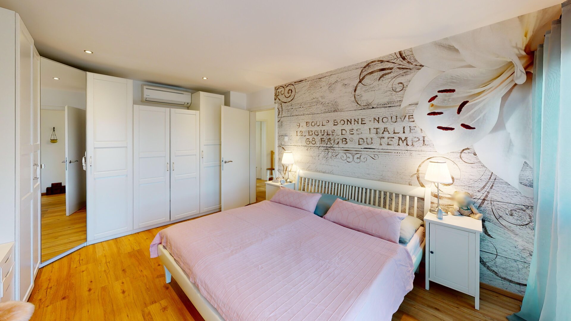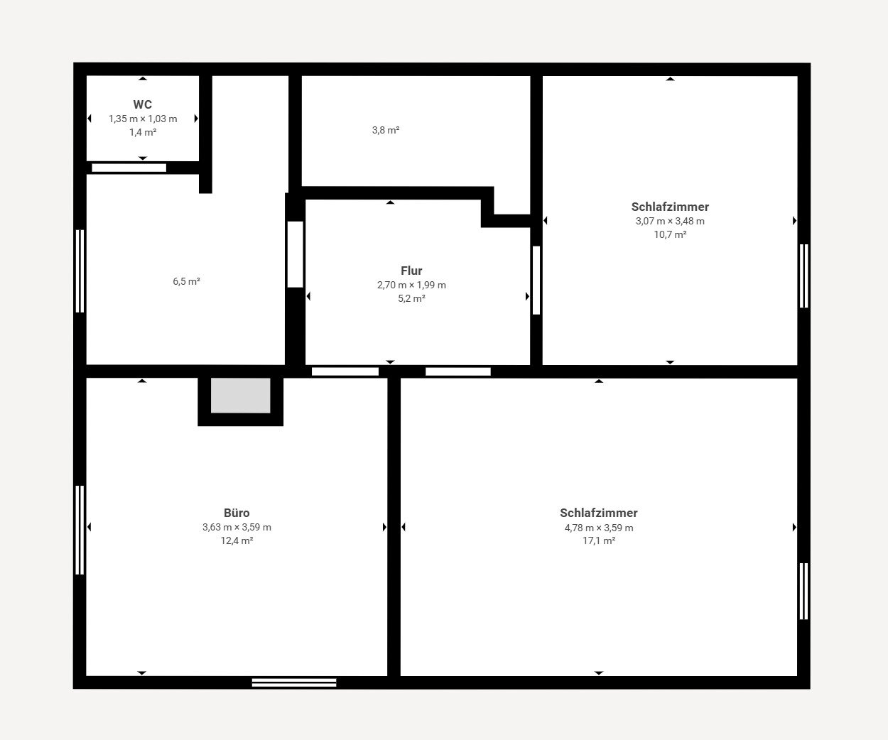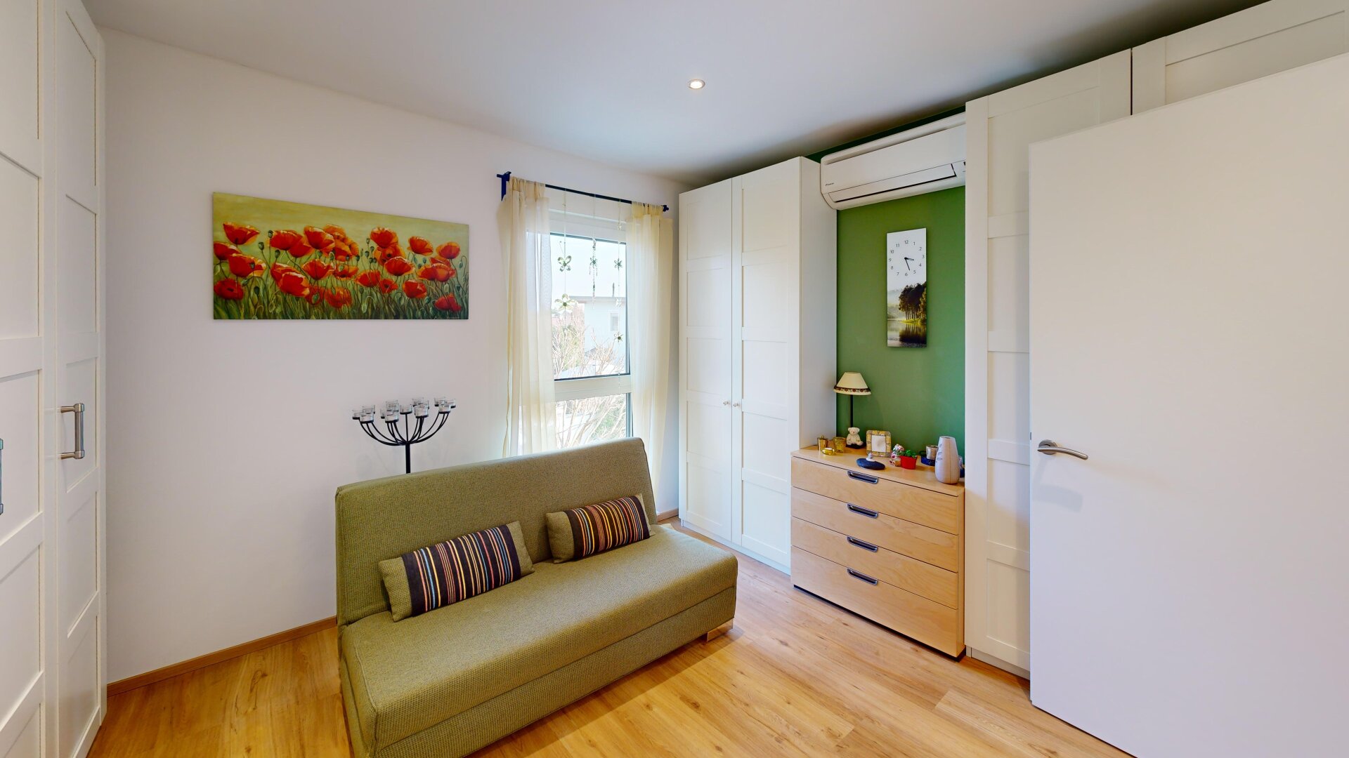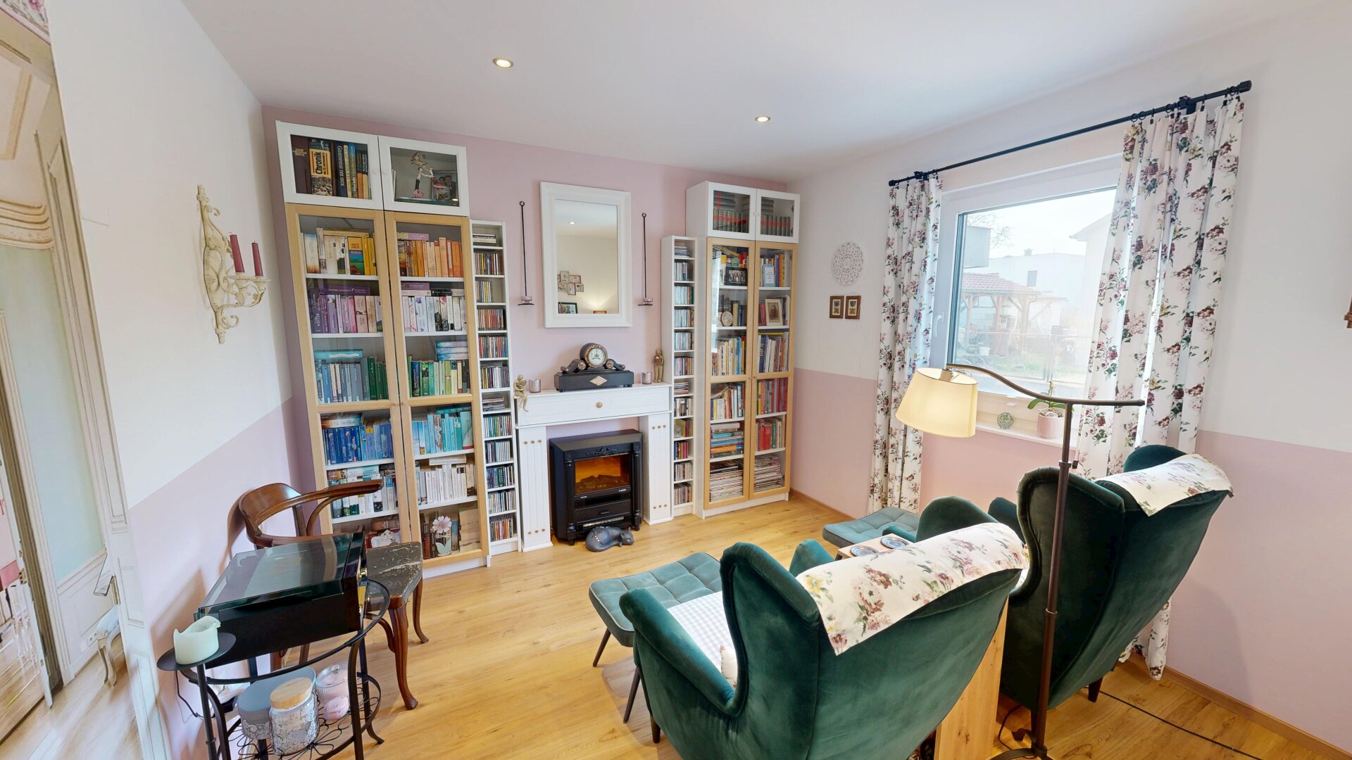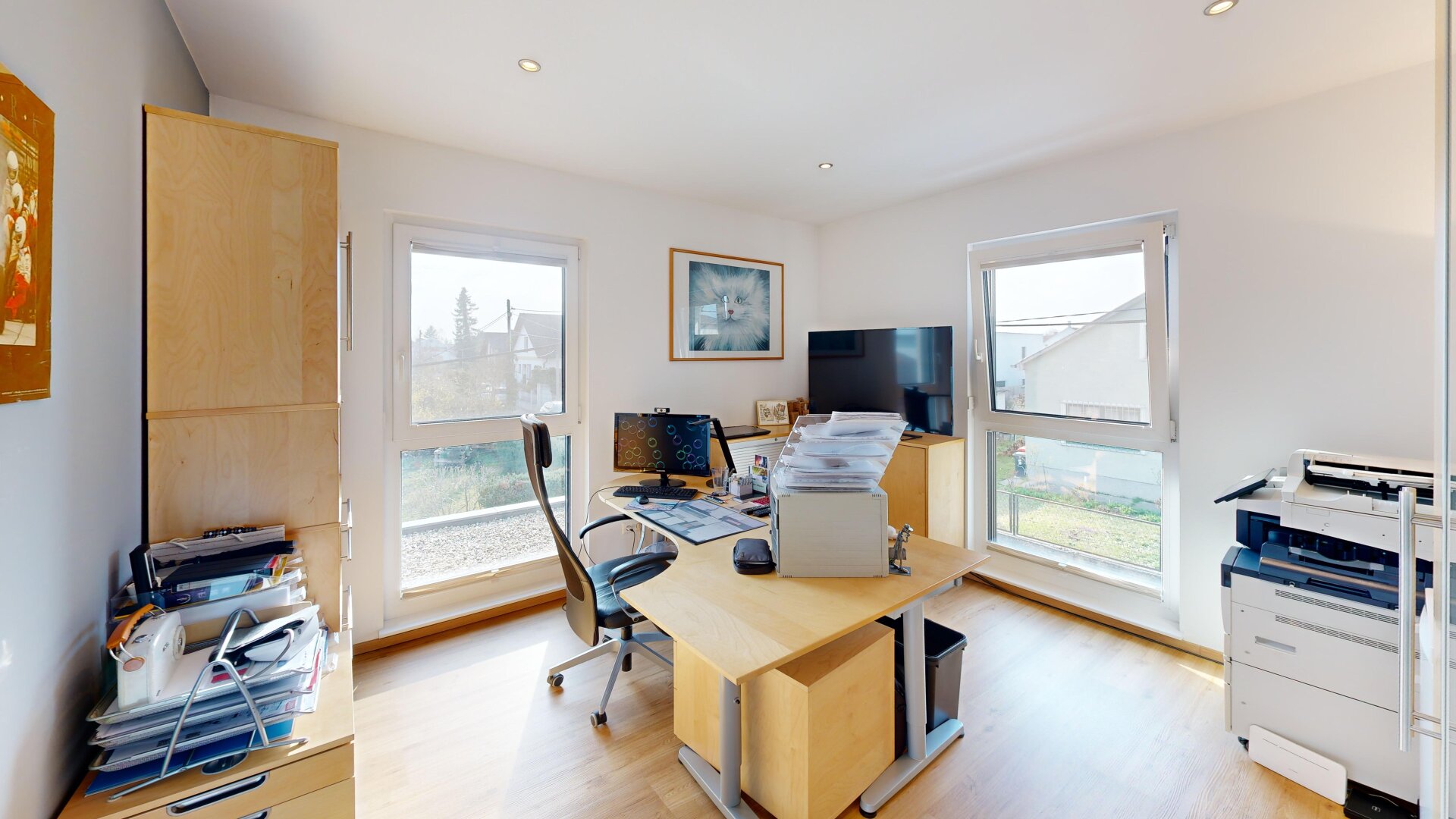 Im Obergeschoss liegen drei Zimmer (Galerie, Arbeits-/Schlafzimmer, Kinderzimmer) sowie ein Badezimmer mit WC.
