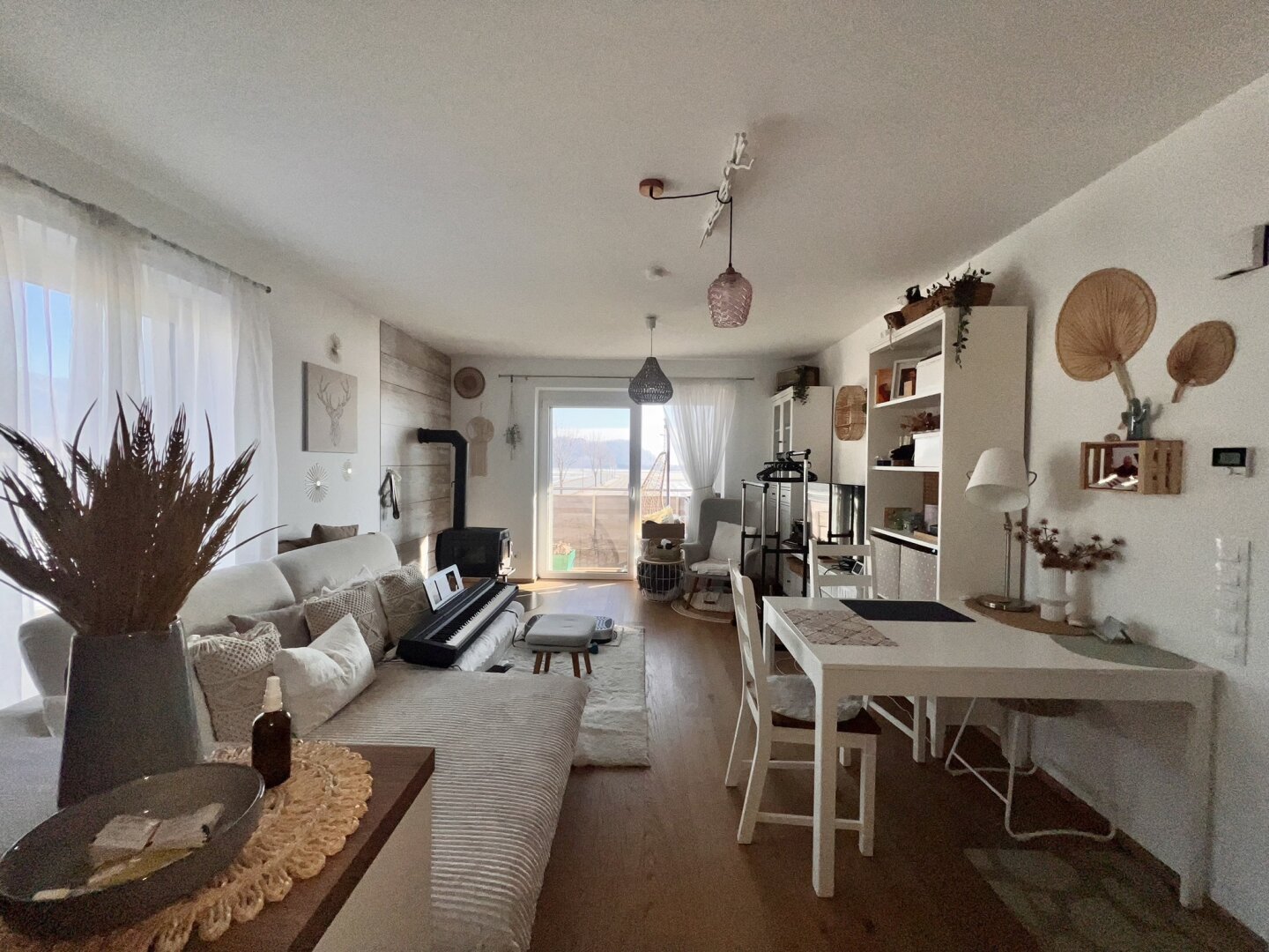 Der lichtdurchflutete Wohnbereich lädt zum Ankommen und Entspannen ein und wird durch einen hochwertigen Kaminofen mit 7 kW zum Herzstück der Wohnung. Dieser sorgt nicht nur für behagliche Wärme, sondern bietet dank integrierter Herdplatte auch ein hohes Maß an Krisensicherheit bei Strom- oder Gasausfall – ein echtes Plus an Unabhängigkeit.