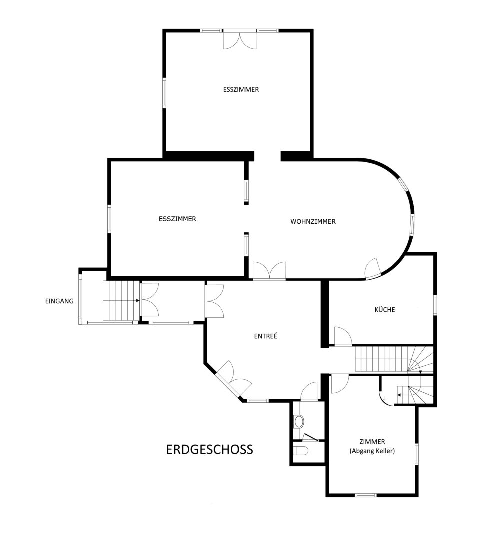 - Erdgeschoß: Eintritt erlangt man über den Stiegenaufgang aus dem Garten, in das großzügig angelegte Entree. Der Wohnbereich gliedert sich in insgesamt 3 Räume, die allesamt repräsentativ eingerichtet werden können, um den Flair des Hauses zu unterstreichen. Die Küche ist hier angrenzend an das Wohn-/Esszimmer positioniert, wobei die Küchengestaltung Ihnen überlassen wird (derzeit ist keine verbaut).