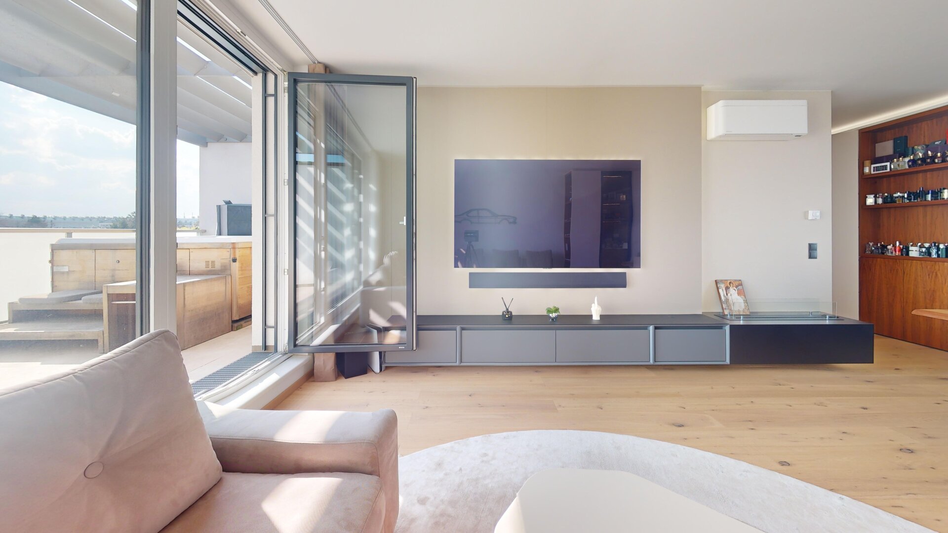Wohlempfinden und Luxus - Absolut neuwertige Wohnung in neuem, hochwertigem Haus, die voll möbliert wie liegt und steht übergeben wird. Es wurden beste Materialien, Einrichtung und Geräte verwendet, die sich durch Wohnkomfort und Langlebigkeit auszeichnen. Eichenparkett in den Wohnräumen, Steinzeug in den Sanitärräumen. Angenehme Fußbodenheizung über Fernwärme und Klimatisierung der gesamten Wohnung über DAIKIN Style-Geräte garantieren angenehmes Raumklima über das gesamte Jahr. Außenliegende elektrische Raffstores zur Beschattung in allen Räumen. Die Wohnung ist äußerst geschmackvoll mit hochwertigen Designermöbeln ausgestattet, bietet sehr viel Stauraum und verfügt über eine Vielzahl von Extras, wie ein Geberit Acquaclean WC, eine Regendusche, elektrische Fensteröffnung im Bad und Wirtschaftsraum, Ambientebeleuchtung in der ganzen Wohnung, Ethanolkamin, großen Safe und einen Jacuzzi auf der Terrasse. Zu der Wohnung gehört ein grosszügiges Kellerabteil mit c. 10 qm. Es fehlt also wirklich an nichts.