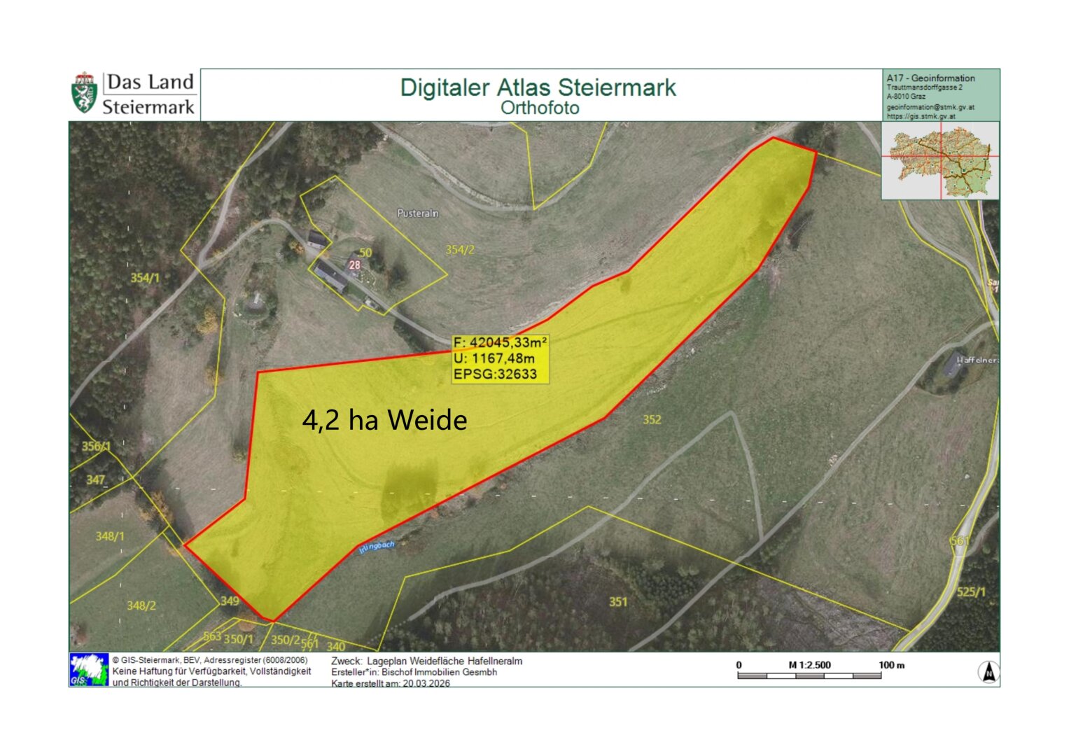 Diese zusammenhängende Weide -Wiesenfläche hat ein Ausmaß von 4,2 ha und ist für Viehwirtschaft in einer Seehöhe von 1.180 m bis 1.260 m bestens geeignet. Dieses Immobilienangebot bietet ideale Voraussetzungen für landwirtschaftliche Nutzung, da für den Viehtrieb genügend Wasser zur Verfügung steht und durch das leicht geneigte Gelände eine maschinelle Bearbeitung auf der ganzen Fläche möglich ist.